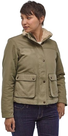 A steady choice for indecisive shoulder season weather the field inspired women s patagonia maple grove insulated jacket is made with sturdy stretch canvas and a durable water repellent dwr finish.